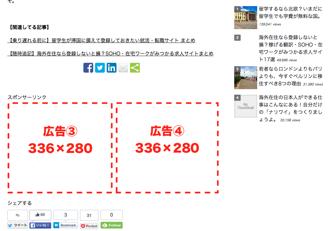 特徴:記事を終わりに配置されるので、最もクリック率の高い場所のひとつです。